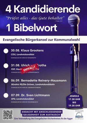 KOMMUNALWAHL Programmänderung bei Andachtsreihe "Bürgerkanzel zur Kommunalwahl" (28.8.)
