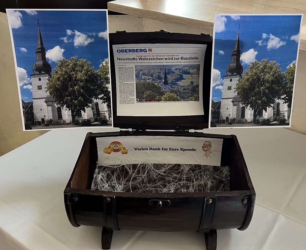 Dietrich Schüttler, Pfarrer der Evangelischen Impuls-Kirchengemeinde Lieberhausen-Bergneustadt, und Walter Fresen vom Förderverein Altstadtkirche Bergneustadt e.V. freuten sich über die Verbundenheit von Manfred Bösinghaus zum Wahrzeichen von Bergneustadt und über die Großzügigkeit der Spenderinnen und Spender.