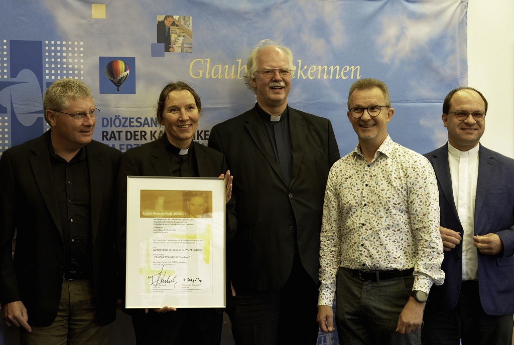 Die ökumenische Demokratiekirche Oberberg hat im Kölner Maternushaus den Anton-Roesen-Preis des Kölner Erzbistums verliehen bekommen. Der Diözesanrat der Katholiken im Erzbistum Köln würdigte damit die Arbeit der Demokratiekirche Oberberg in Wiehl-Bielstein, die "mit herausragenden Leistungen ihrer Weltverantwortung gerecht geworden" ist. Überreicht wurde der Preis von Weihbischof Ansgar Puff, Bischofsvikar für den Diözesanrat. Der Preis ist mit 5000 Euro dotiert.