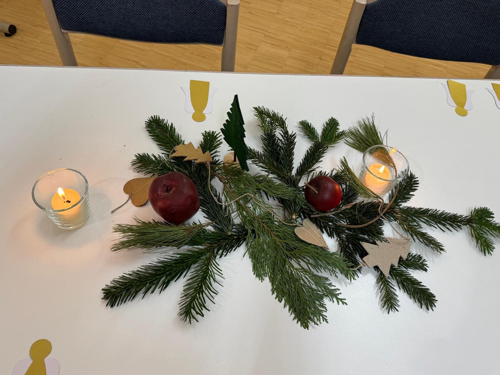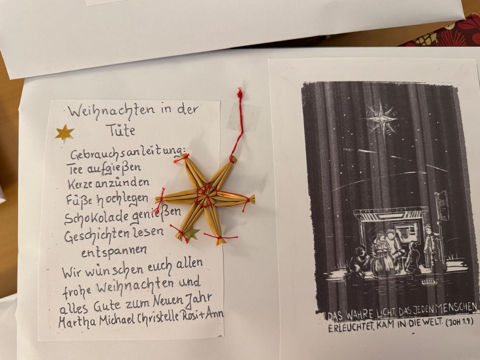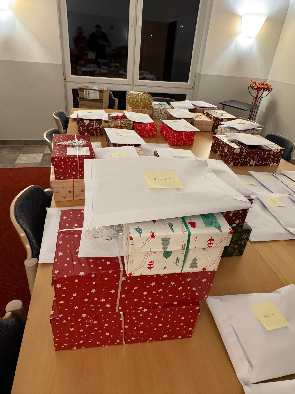 Im evangelischen Gemeindehaus ging es mit Punsch, Tee und Weihnachtsplätzchen weiter. Höhepunkt war die Bescherung: Jedes Kind erhielt ein Geschenkpaket („Weihnachten im Schuhkarton“) und für Erwachsenen gab es einen Umschlag „Weihnachten in der Tüte“ mit kleinen Geschenken und der Weihnachtsbotschaft.