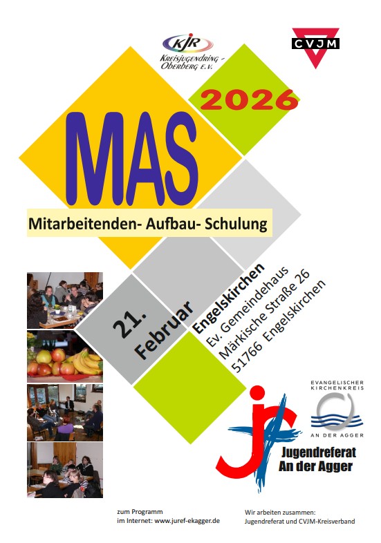 Das Jugendreferat des Evangelischen Kirchenkreises An der Agger lädt haupt- und ehrenamtliche Mitarbeitende aus der Kinder-, Jugend- und Freizeitarbeit, aus der Arbeit mit Konfirmanden, Kindergottesdienstseiner jährlichen Mitarbeitendenaufbauschulung am Samstag, 21. Februar 2026, ins evangelische Gemeindehaus Engelskirchen (Märkische Straße 26, 51766 Engelskirchen) ein.