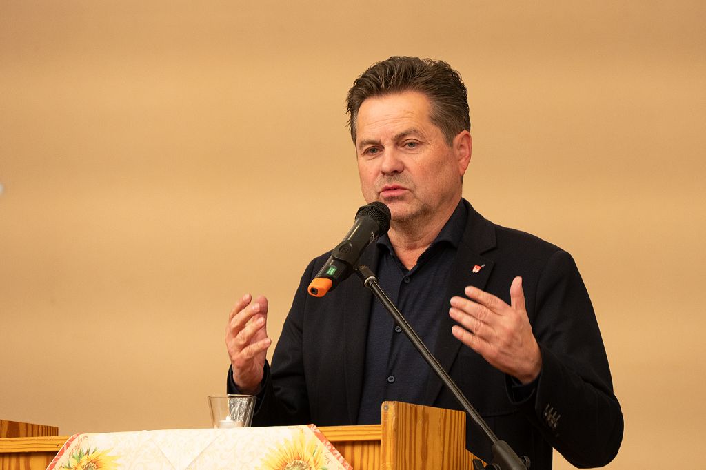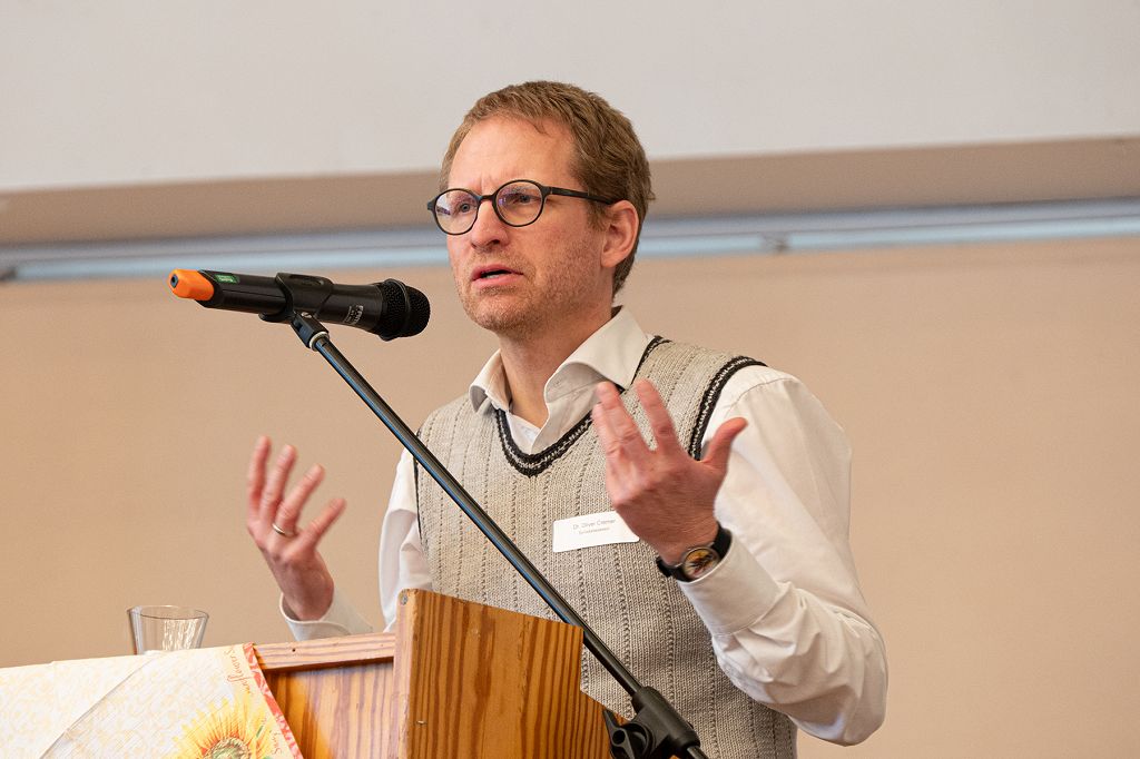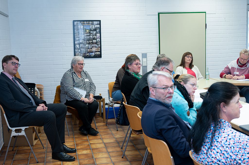 Grußworte sprachen bei der Synode am Freitagabend der Wiehler Bürgermeister Ulrich Stücker und am Samstagmorgen der neue Landrat Klaus Grootens. Den Begriff Exnovation haben beide erst durch die Einladung zur Synode kennengelernt, die Abläufe, Schwierigkeiten und Chancen dahinter sind ihnen jedoch bestens bekannt. "Exnovation - da gehört auch Mut dazu", sagte Stücker. "Mein Angebot: Binden Sie uns in Ihre Überlegungen mit ein, damit wir gemeinsam planen und gemeinsam Wege gehen können." Landrat Klaus Grootens war zuletzt 2021 als Kreisdirektor zu Gast in der Kreissynode gewesen. Die Coronazeit, sagten der Landrat, habe gelehrt, dass es am besten ist, als Kreis und Kirche gemeinsam über Dinge zu reden und das Beste daraus zu machen. In einer Zeit, in der alles immer schnell gehen müsse, sei auch "besonnenes Bedenken" wichtig.