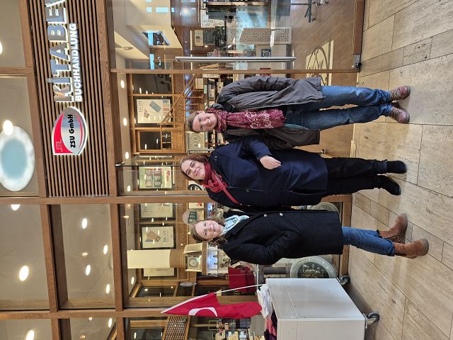 Eine ehrenamtliche Moschee-Guide begleitete die Gruppe durch die Moschee. „Welchen ersten Eindruck haben Sie, wenn Sie jetzt hier in der Moschee sind?“ fragte sie. Die Antworten waren durchweg positiv: einladend, hell, feierlich, spirituell, ansprechend mit den vielen Fenstern und den kunstvollen Kalligrafien an der Wand. Durch die vielen Fenster kann man von außen in die Moschee hineinschauen und von innen heraus auf die vielbefahrene Innere Kanalstraße. In der fast zweistündigen Führung ging es um die Baugeschichte des imposanten Gebäudes von Paul Böhm aus der renommierten Kölner Architektenfamilie Böhm, um Glaubens- und Gebetspraxis und interkulturelle und interreligiöse Praxis. Viermal in der Woche gibt es öffentliche Führungen: mittwochs, freitags, samstags und sonntags jeweils um 15.15 Uhr. Die Moschee sei aber immer, auch abseits der Führungen öffentlich zugänglich. „Kommen Sie ruhig herein, Sie können beim Gebet zusehen oder mitmachen. Frauen können unten mit den Männern beten oder wenn sie für sich sein wollen oben auf der Balustrade.“ Die Schuhe werden am Eingang ausgezogen und komfortabel in abschließbaren Schränken verstaut. Frauen werden gebeten, aus Respekt vor Gott und Zeichen der Andacht den Kopf zu bedecken. Alle Z-Kurs-Teilnehmerinnen hatten Tücher oder Schals dabei und hatten viel Spaß beim ungewohnten Binden der Tücher.