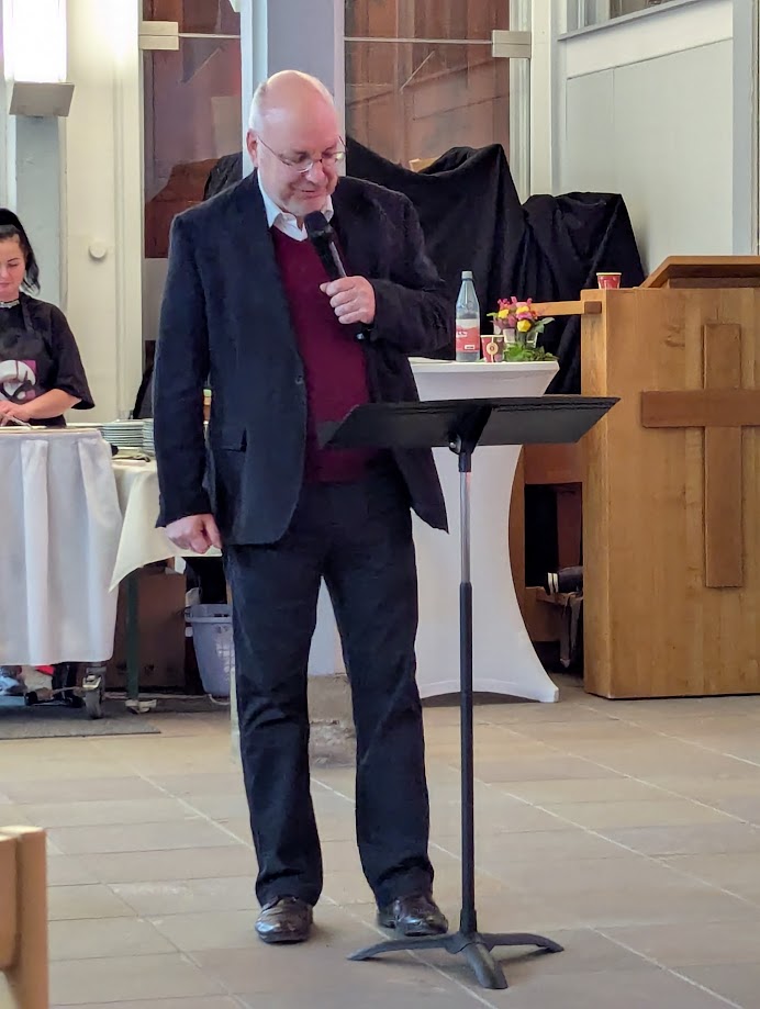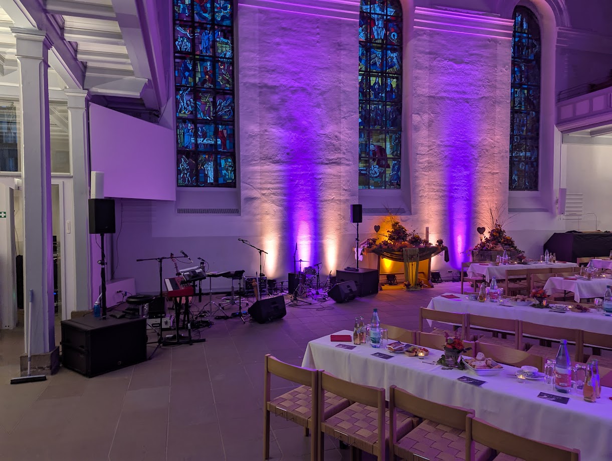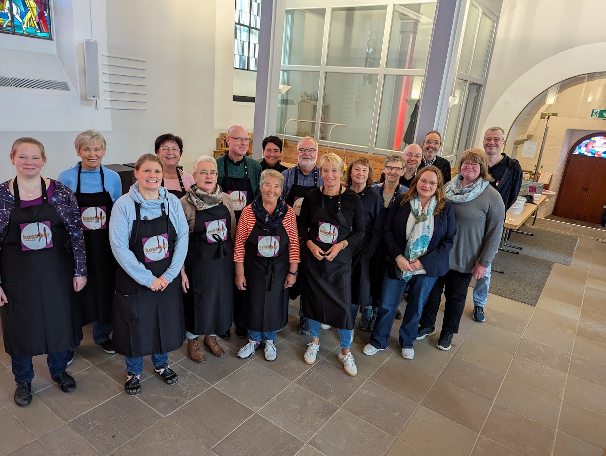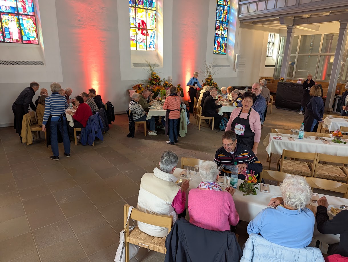 Am ersten Tag der “kostbar” hatten die Ehrenamtlichen 90 Mittagessen in der Kirche ausgegeben, am Freitag waren es 120. Ein Gast hatte kurzfristig aus dem Radio von der Aktion gehört und zu Hause in der Küche alles stehen und liegen gelassen und lieber in der Kirche Mittag gegessen. Viele fühlten sich angesprochen und lobten besonders den freundlichen Empfang vor der Kirchentür und in der Kirche. Mehr als 50 Haupt- und Ehrenamtliche halfen mit als Tischkellner, Spülhilfe, Auf- und Abbauhelfer und Seelsorgende. Kantor Samuel Schmitt und Pfarrer Michael Striss gestalteten kurze Andachten mit geistlichem Impuls “Gott stellt sich vor und macht sich bekannt”.