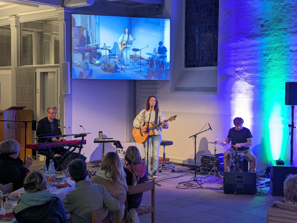 Allein am Sonntag waren 140 Menschen der Einladung zu einem Frühstücksgottesdienst im Gemeindehaus gefolgt. Am Samstagabend hatte es Poetry Slam mit der Künstlerin und Musikerin Valerie Lill gegeben. 70 Gästen genossen den Abend mit Texten und Liedern zum Thema Mutmachen, den die jungen Künstlerin mit ihrer Band gestaltete. An den Tischen gab es Brot und Dips, passend zum Thema der Vesperkirche “kostbar”: Wir laden Menschen zum Essen und zur Gemeinschaft ein.