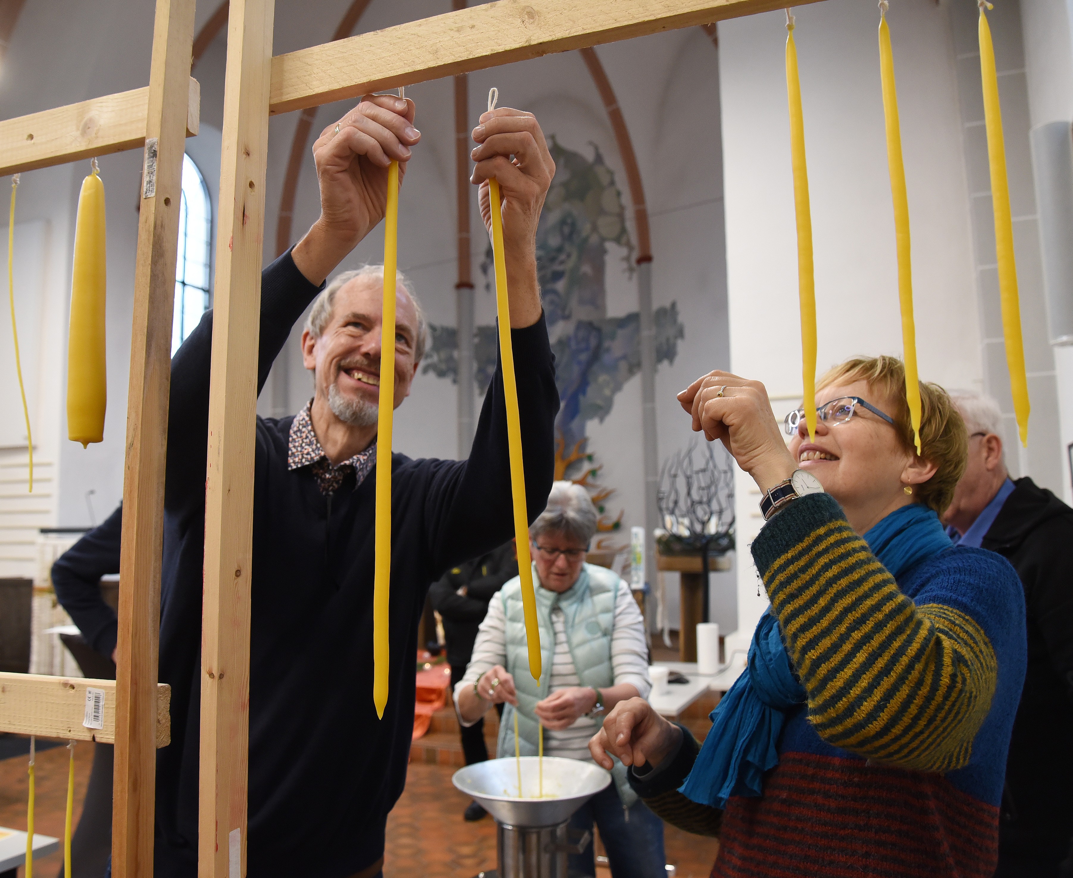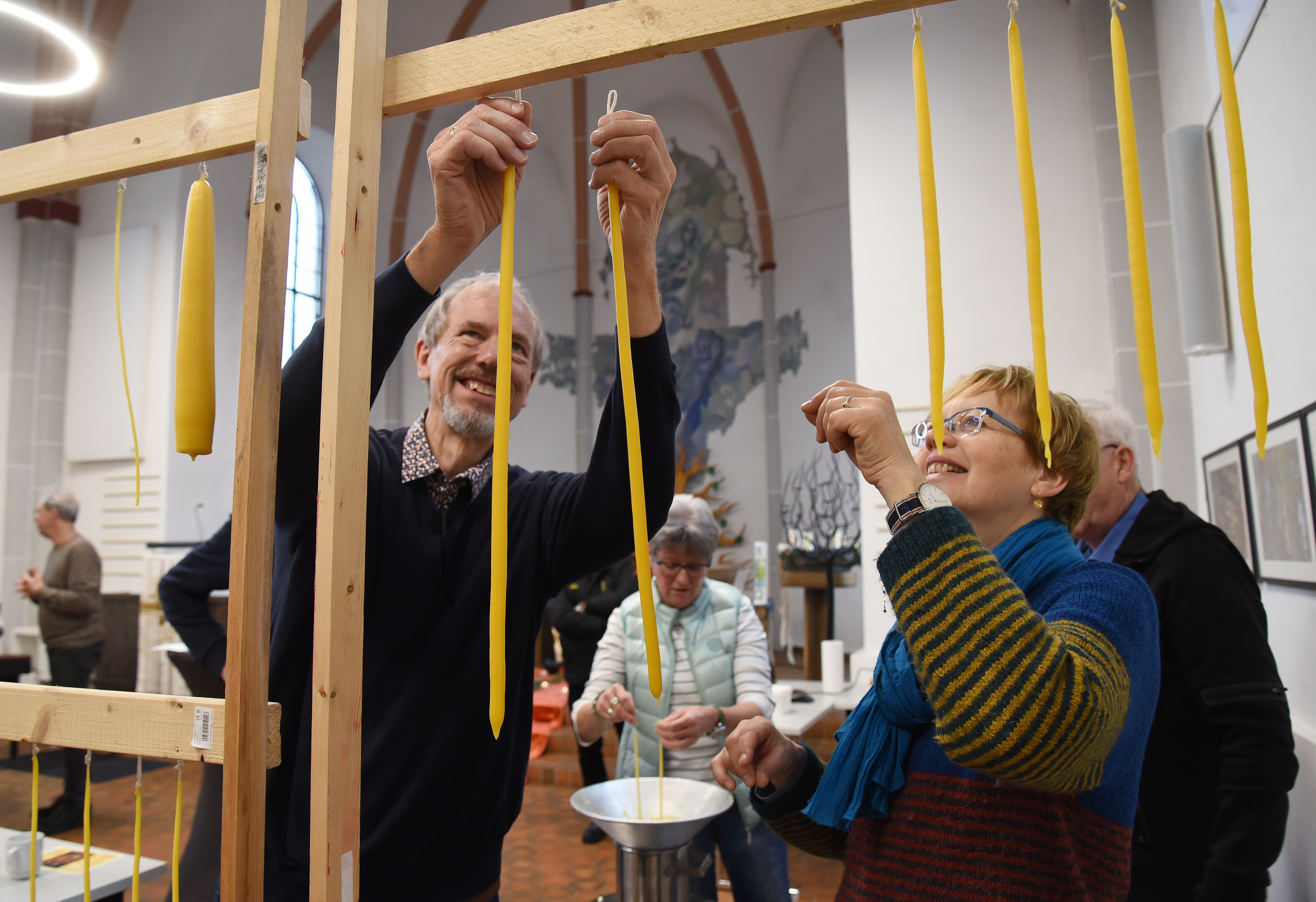 Wir dürfen Kerzen ziehen. Aus Honigwachs, das mit seiner fast goldenen Farbe so schön zur Weihnachtszeit passt. Kirchenmusiker Michael von Rekowski zeigt mir, was ich tun muss, nachdem er mir sorgfältig zwei Dochte zurechtgeschnitten hat. Ich tauche die Dochte ins flüssige Wachs, ziehe sie gerade. Ich lasse meine noch ziemlich dünnen Wachsstäbchen trocknen, tauche wieder und staune, wie schnell die beiden Kerzen wirklich wie Kerzen aussehen. Doch: Nicht zu schnell, sonst wird die Oberfläche rau. Nicht zu langsam, sonst schmilzt mir meine schöne Kerze wieder weg. Während auch ich mit den anderen Teilnehmenden ins Gespräch komme, nehmen unsere Kerzen Form an, auch meine Tauchaktionen werden entspannter. Schon muss wieder Wachsgranulat nachgefüllt werden, denn wir alle lassen unsere Kerzen fleißig dicker werden.